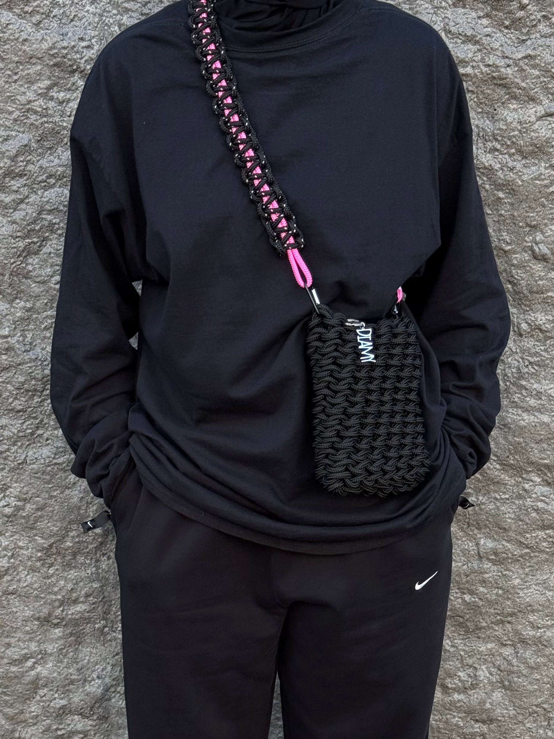 bandoulière noir réfléchissant - fil intérieur rose bonbon - mousquetons noirs