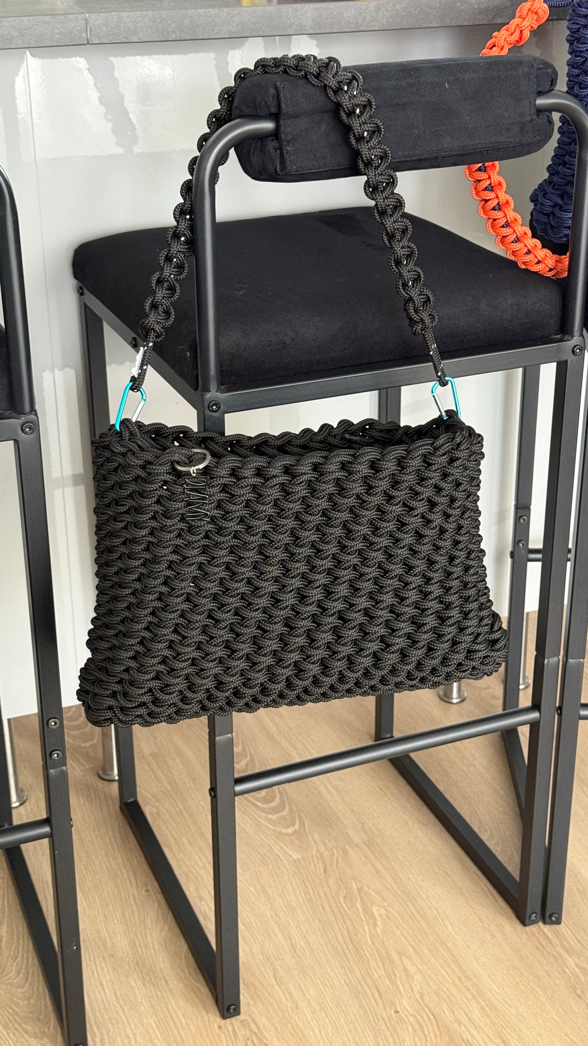 et en noir - fil intérieur noir réfléchissant- mousquetons bleus ciel sur un Panier noir.