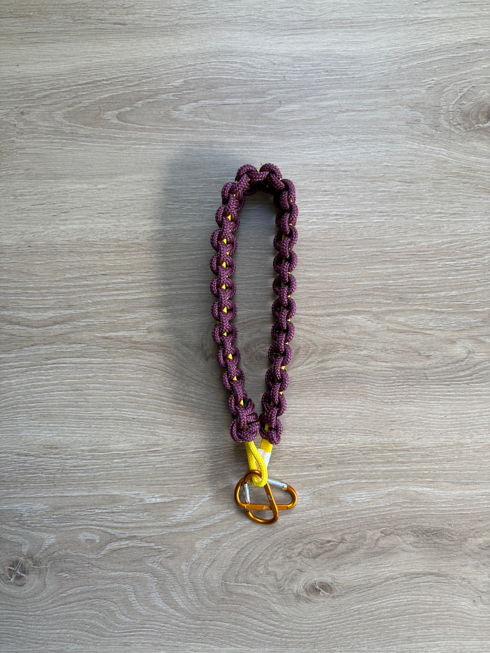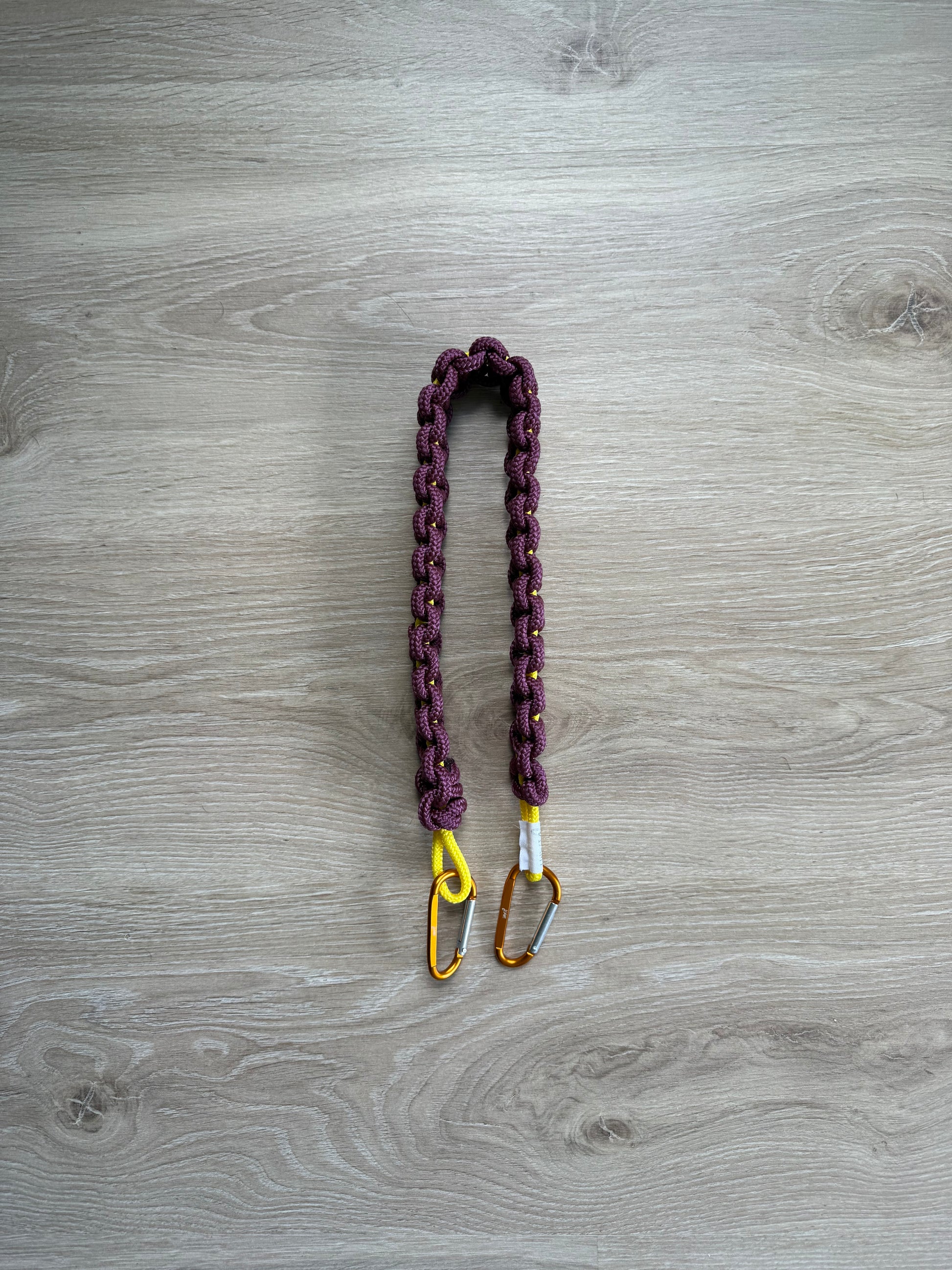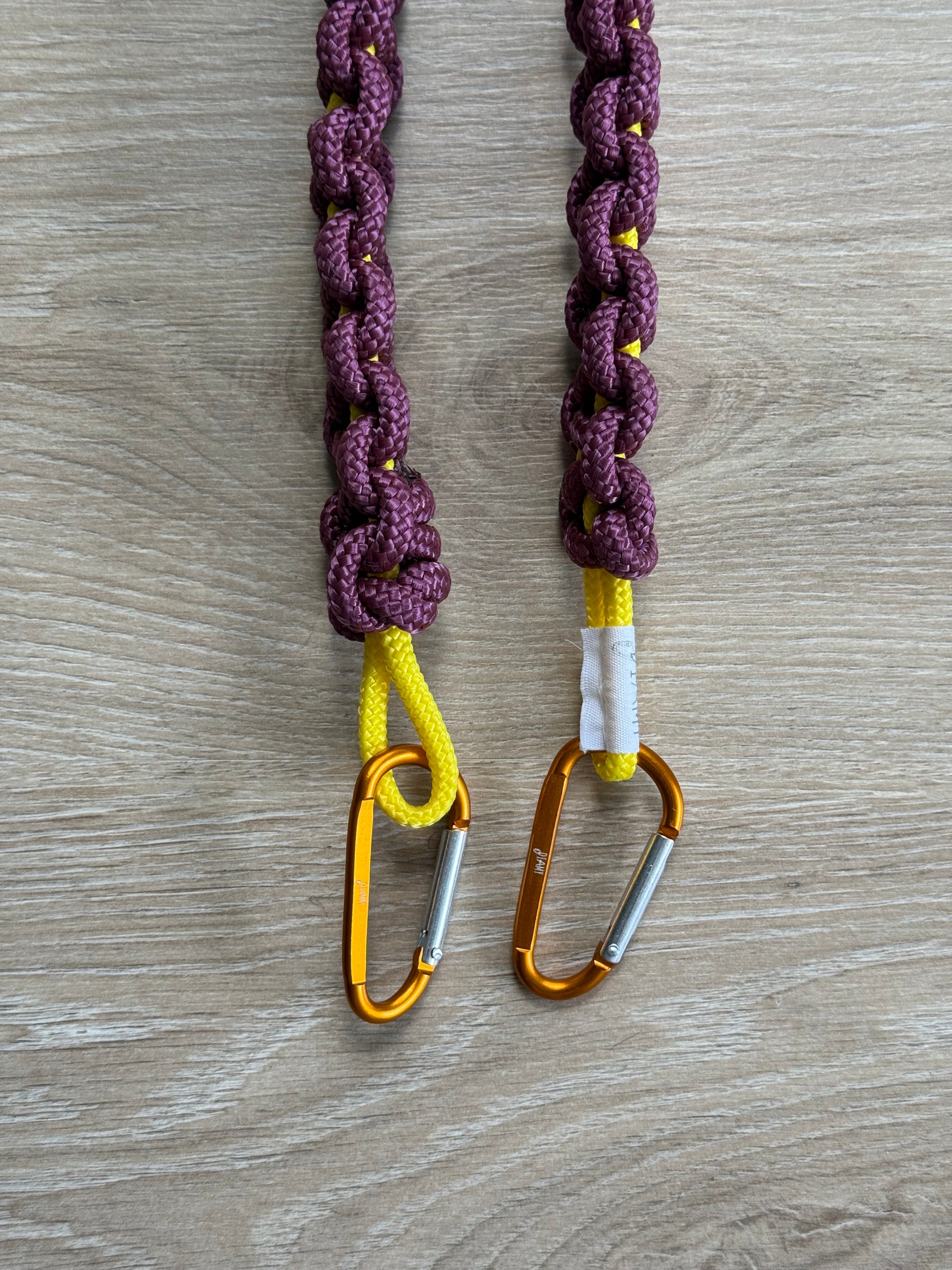 La anse AMY bordeaux - fil intérieur jaune - mousquetons oranges ~ 60 cm