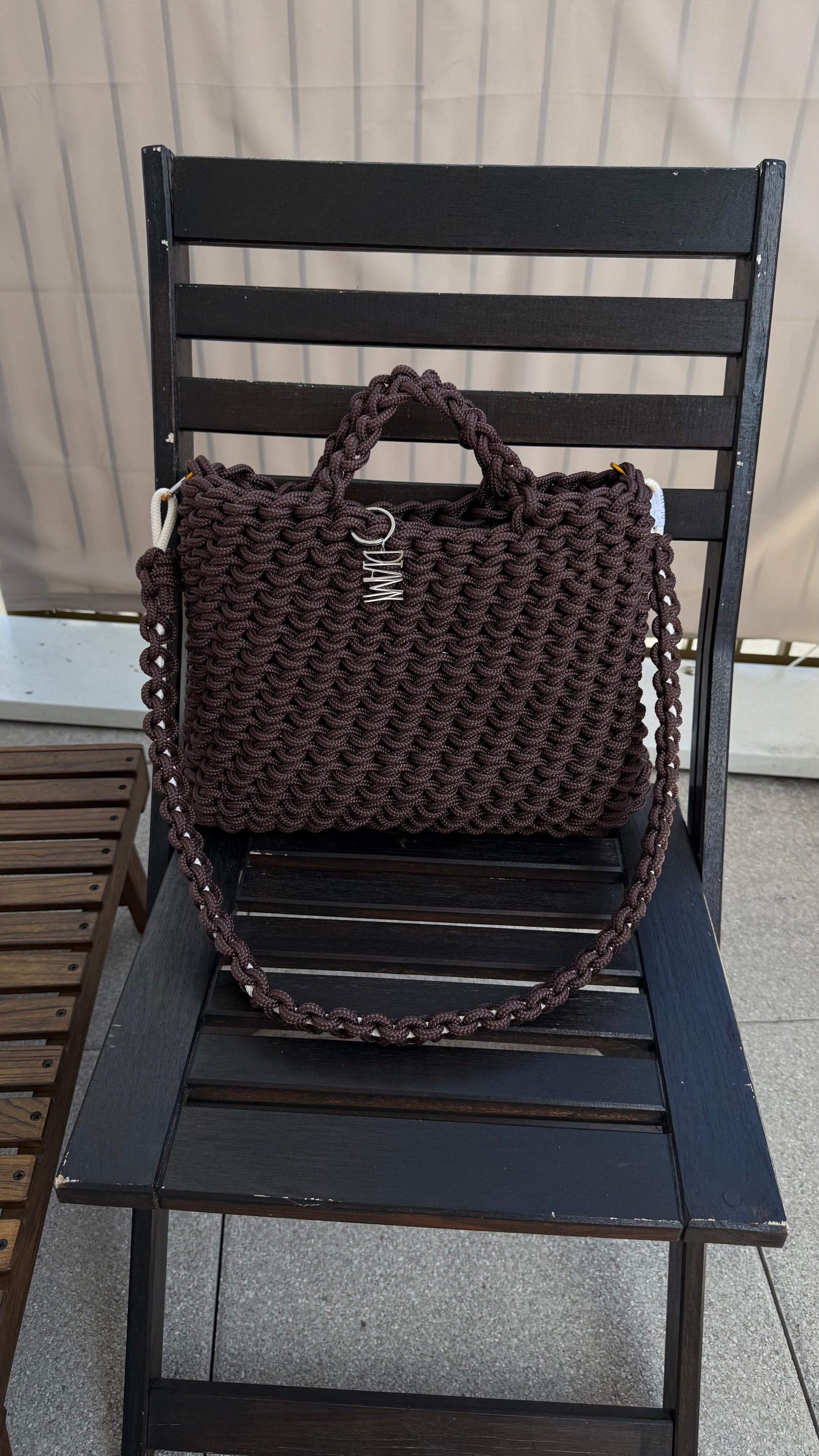 et en marron - fil intérieur crème - mousquetons oranges sur un Panier marron.