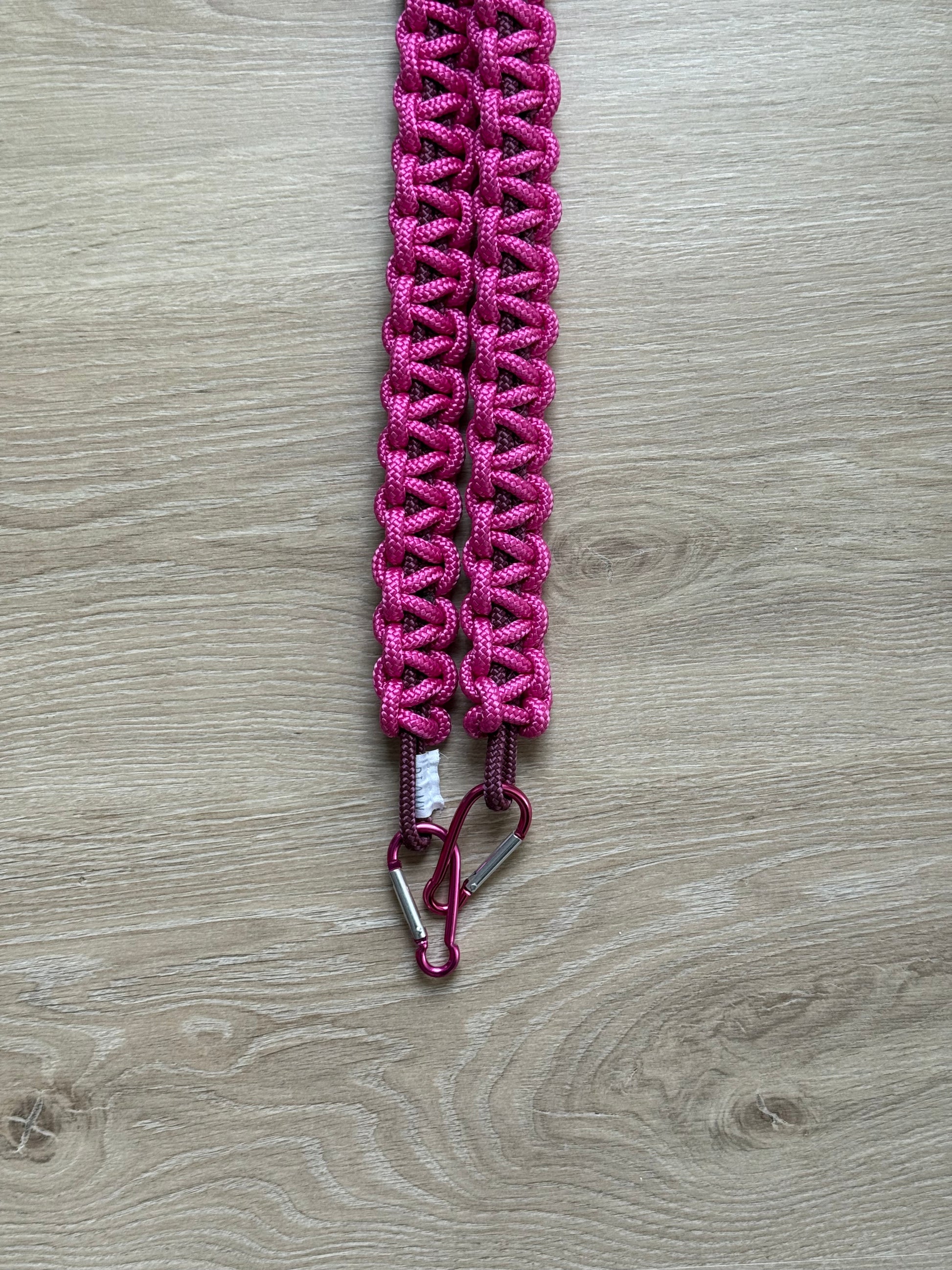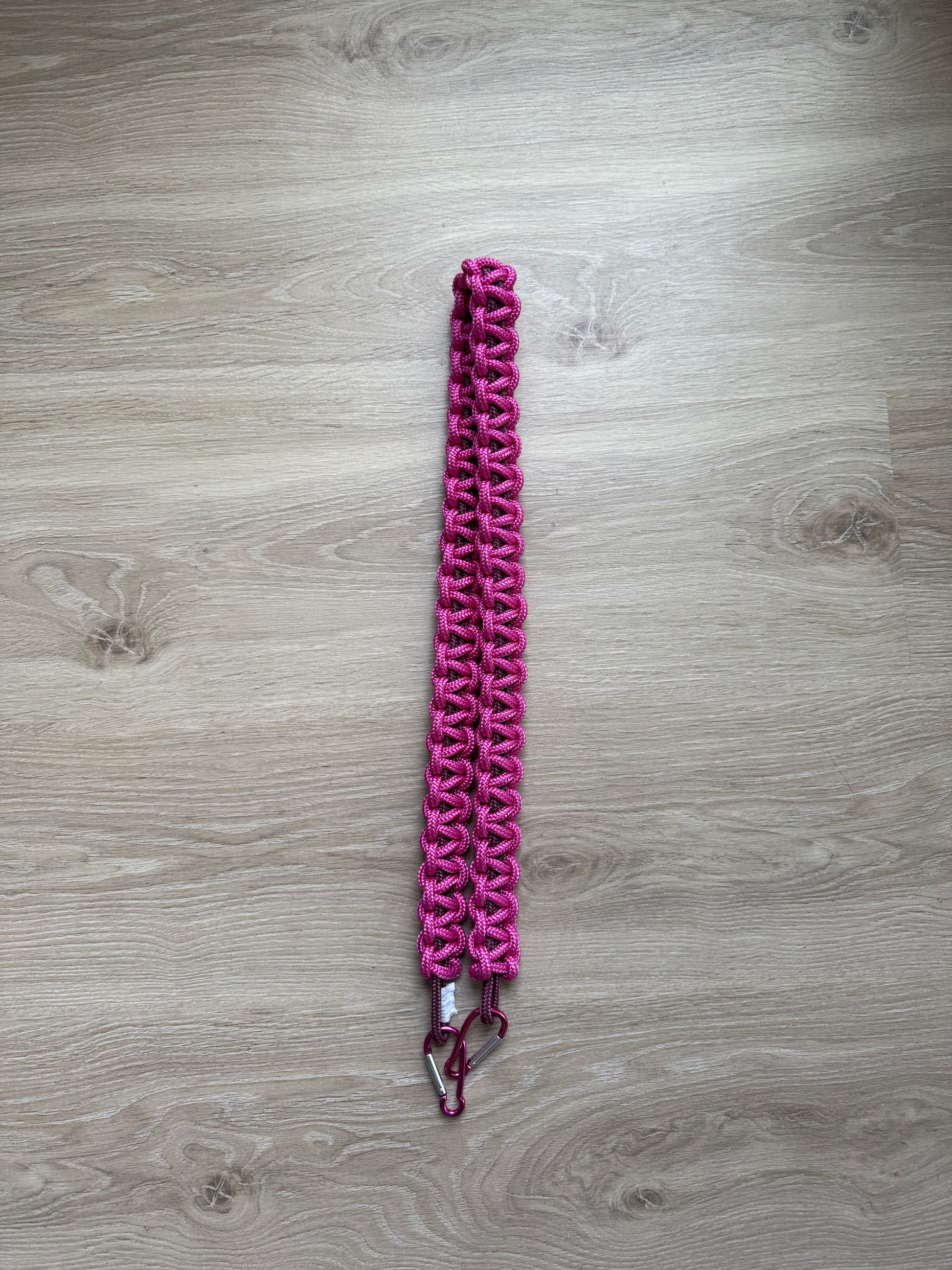 La bandoulière AMY framboise - fil intérieur aubergine - mousquetons roses ~ bandoulière 100 cm