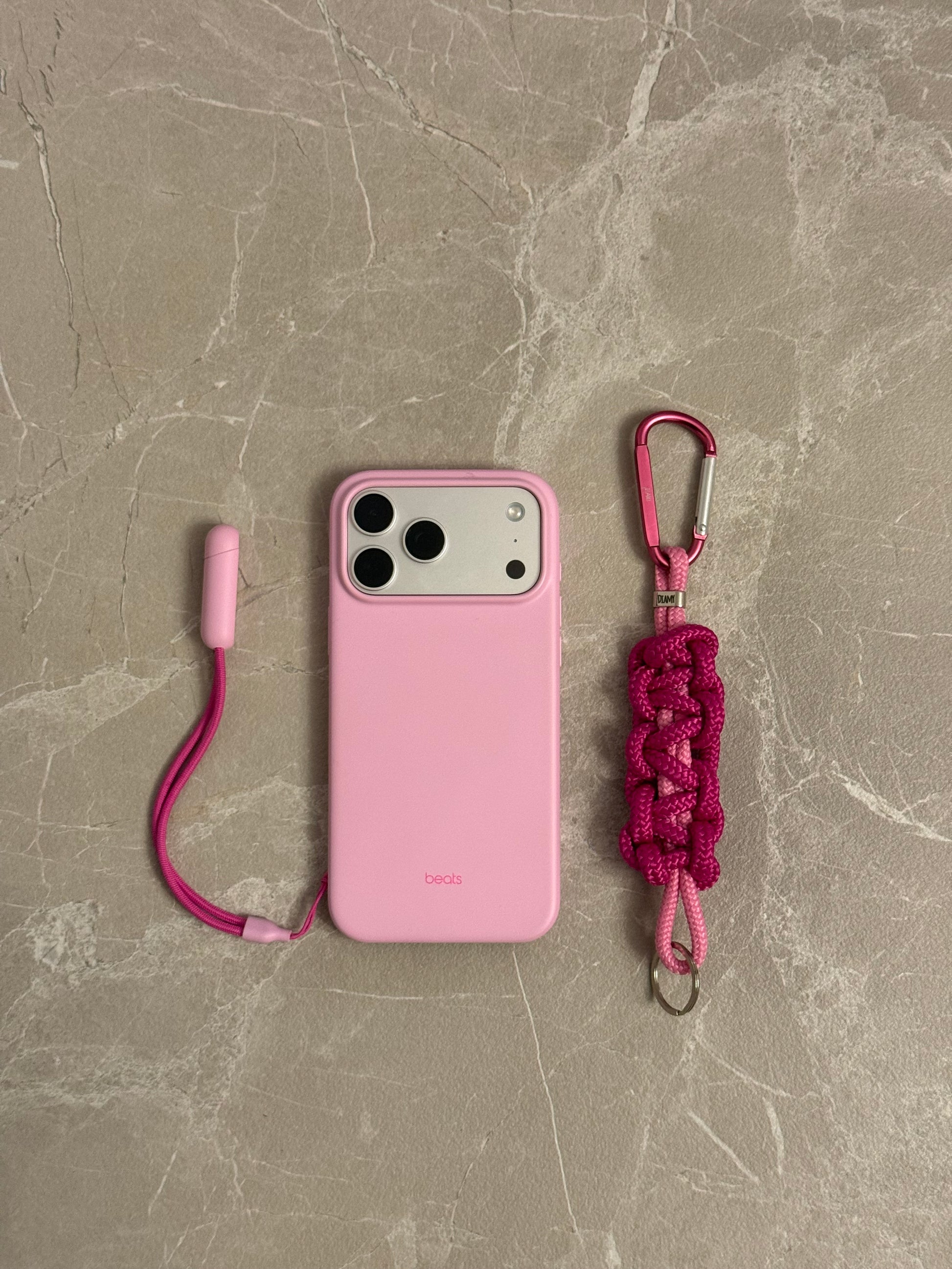 en framboise - fil intérieur rose bonbon - mousqueton rose,