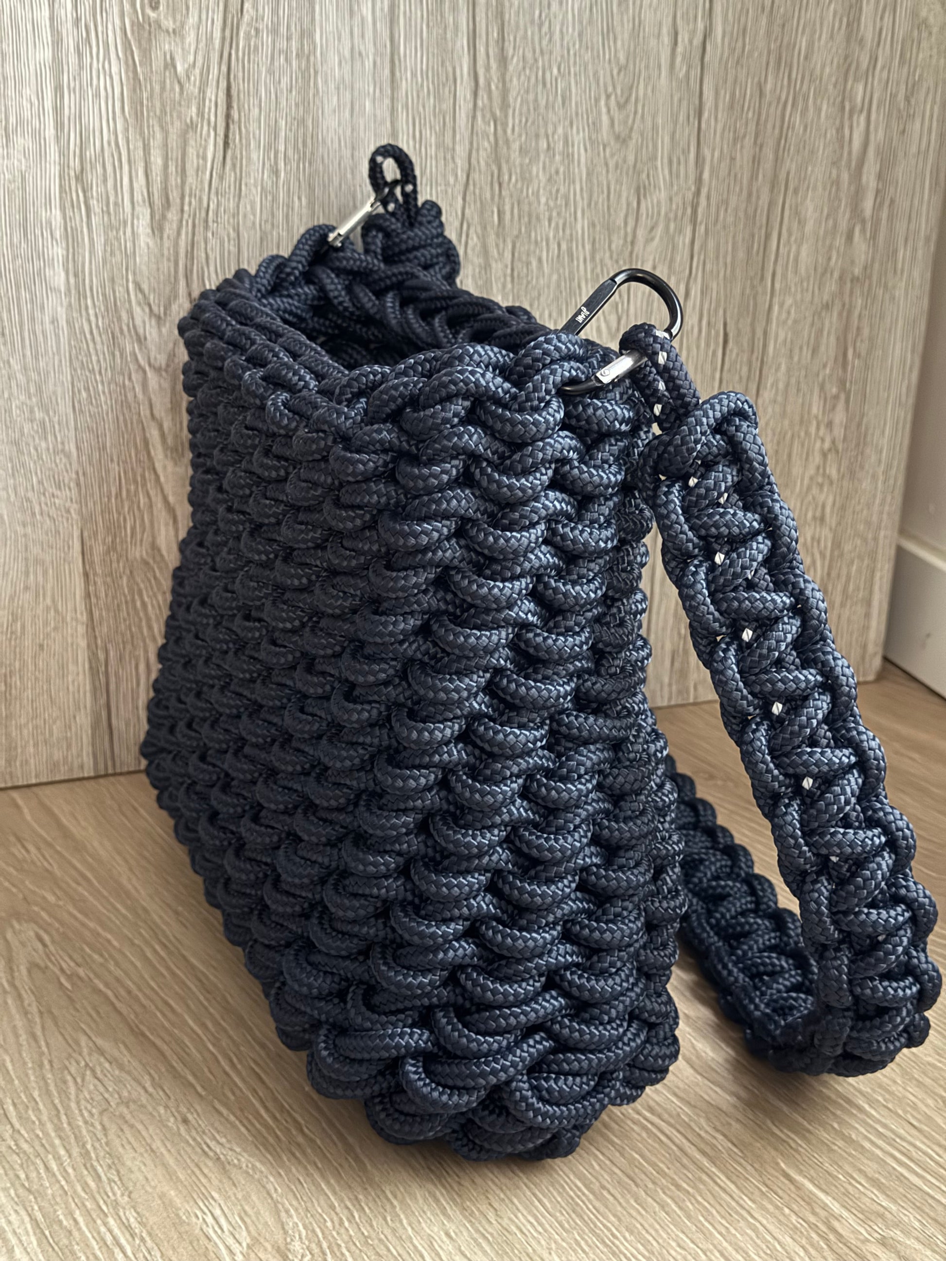 Ici en bleu nuit - bandoulière bleu nuit - fil intérieur bleu réfléchissant - mousquetons noirs.